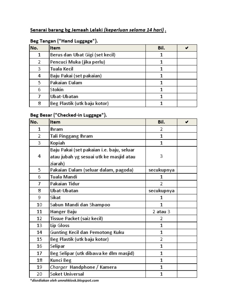 BAGI LELAKI Senarai barang-barang dalam beg besarbeg pakaian 30kg 1 Kain ihram 2 Pasang 2 Tali pinggang 1 utas 3 Baju melayu 2 helai 4 Baju biasat-shirt 4 helai 5 Singlet berlengan dan berzip 4 helai. Kepada pelanggan-pelanggan yang dihormati dan dikasihi. Bawa buku sembahyang sunat semasa ke masjid lebih-lebih semasa menunggu untuk waktu subuh sembahyang sunat tasbihtahajjud taubat hajat witir.